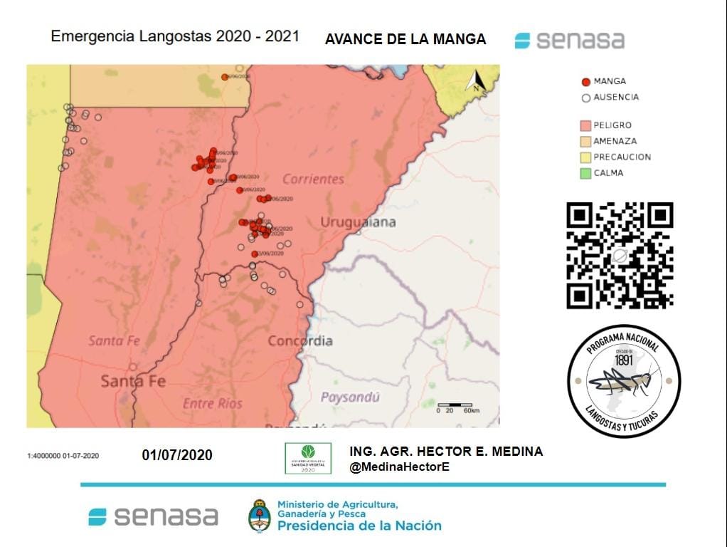 蝗蟲大軍在五月底從巴拉圭進入阿根廷的Formosa省,在之後已行進了將近1.000公里,每天最快可以150公里的速度前進,視氣候因素也可能只有幾公里的速度推進。目前已經穿過Chaco省和Santa Fe省,如今已在Corrientes省,且正步步逼進Entre Ríos省。