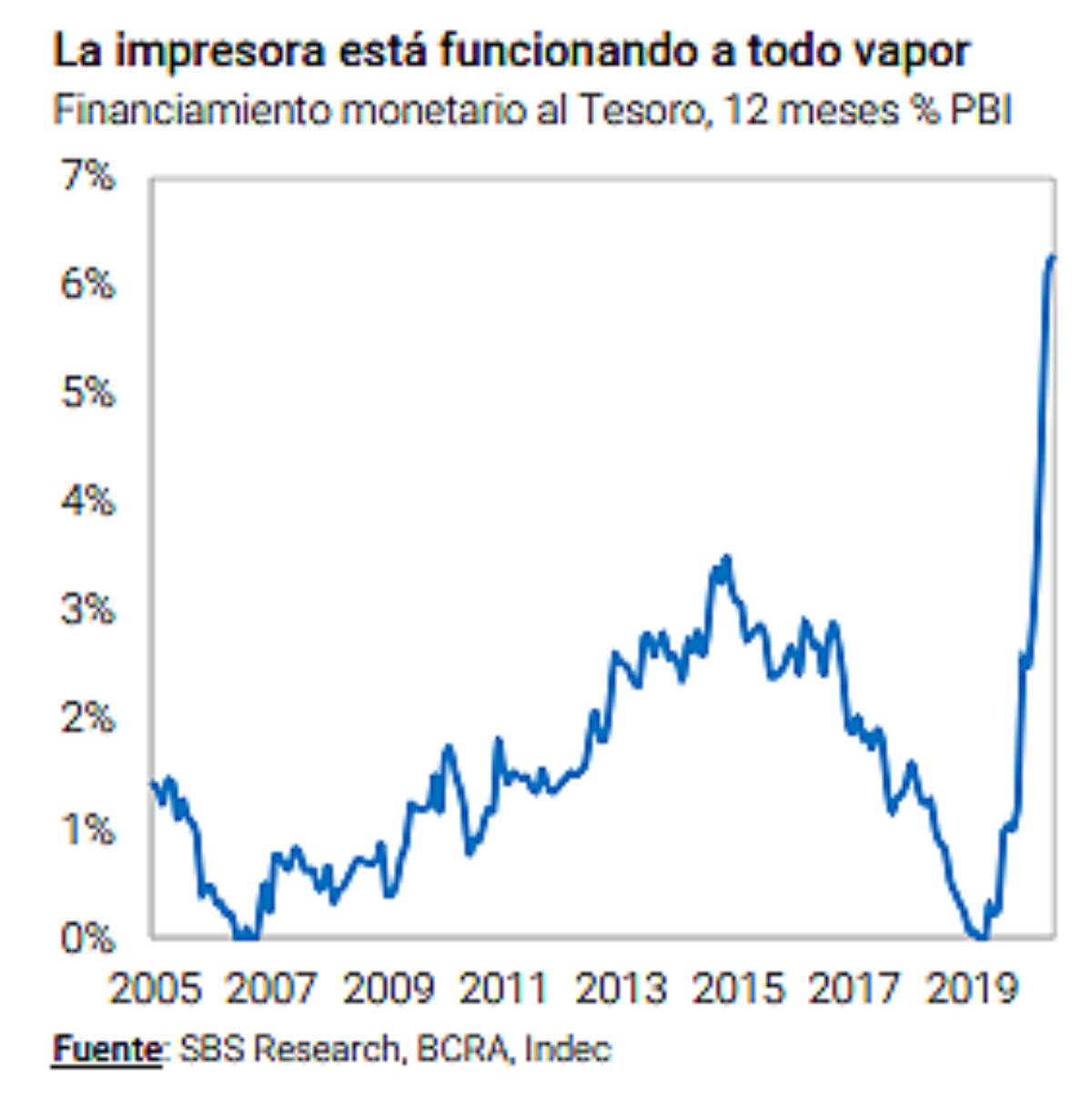 除了全民隔離對經濟造成的影響,違約倒債危機,政府失去國外融資的可能,而國內的稅收又必然將減少,國庫只能不斷的向中央銀行 (BCRA) 透支、挪借利潤 (印鈔票),預期八月就將超越國內生產總值–PBI–的6%。