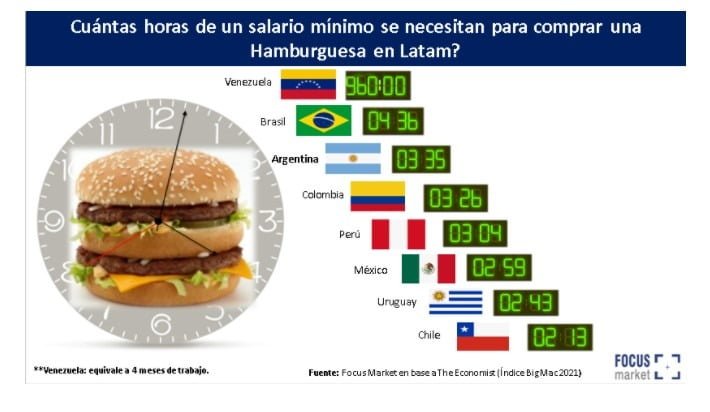 嚴格來說,以最低薪資來論,在阿根廷買一個漢堡需要工作 3 小時 35 分鐘。在委內瑞拉購買一個漢堡需要工作 960 小時,在烏拉圭需要 2 小時 43 分鐘,在智利需要 2 小時 13 分鐘。這項研究的結論是:阿根廷的物價對阿根廷人來說很貴,但對外國人來說相對很便宜。