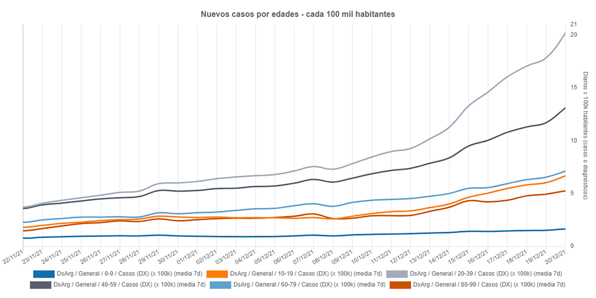 最多的年齡段是 20-39 歲,每 10 萬人中發現 20,18 例新增感染;一個月前的數字,幾乎不到 5 例。
