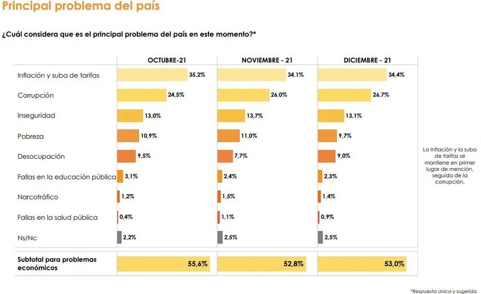 超過半數(53%)的阿根廷人認為經濟問題(含通貨膨脹及各種費率)是他們最主要擔心的問題,其次是貪污問題,第三名是治安問題,貧窮率和失業率則分別排在第四和第五的位置。