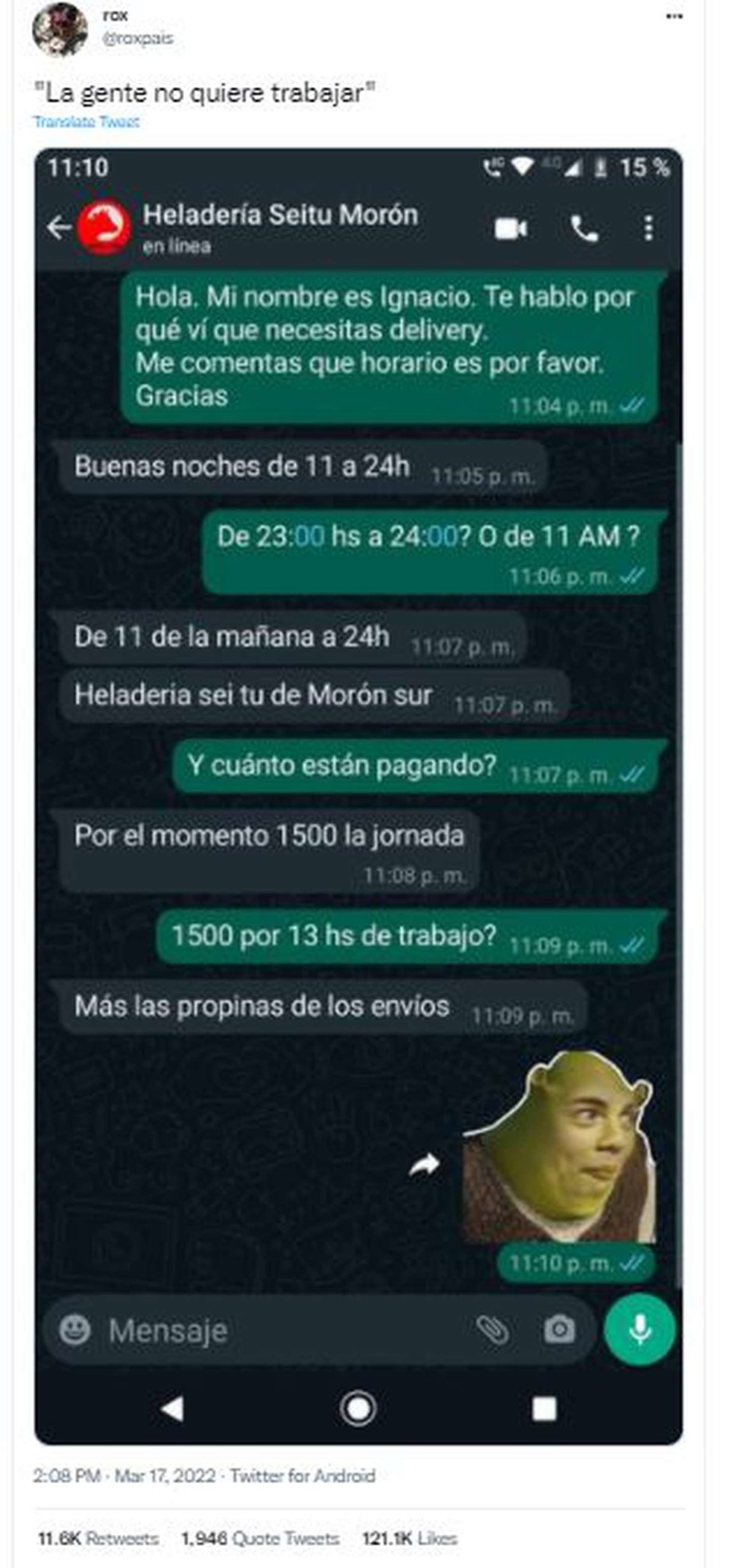 话说,在布省Morón市,有某间知名连锁冰淇淋店贴告示,要招送餐小哥。待业闺中的Ignacio于是联系了业主,以下是双方的对话内容。